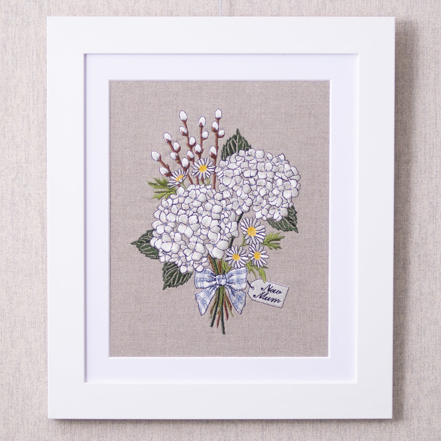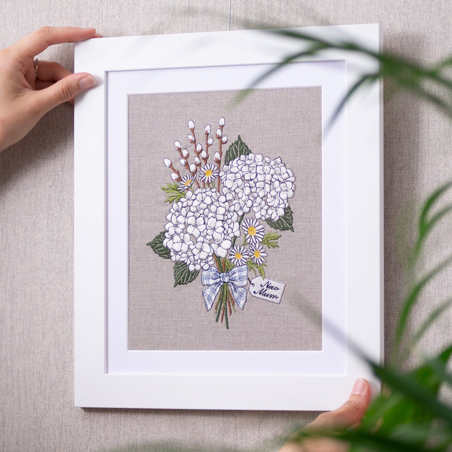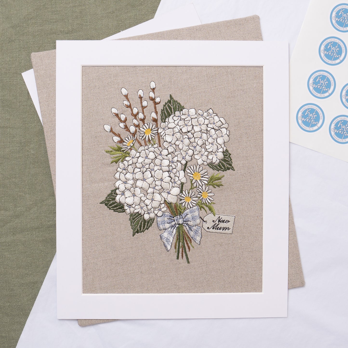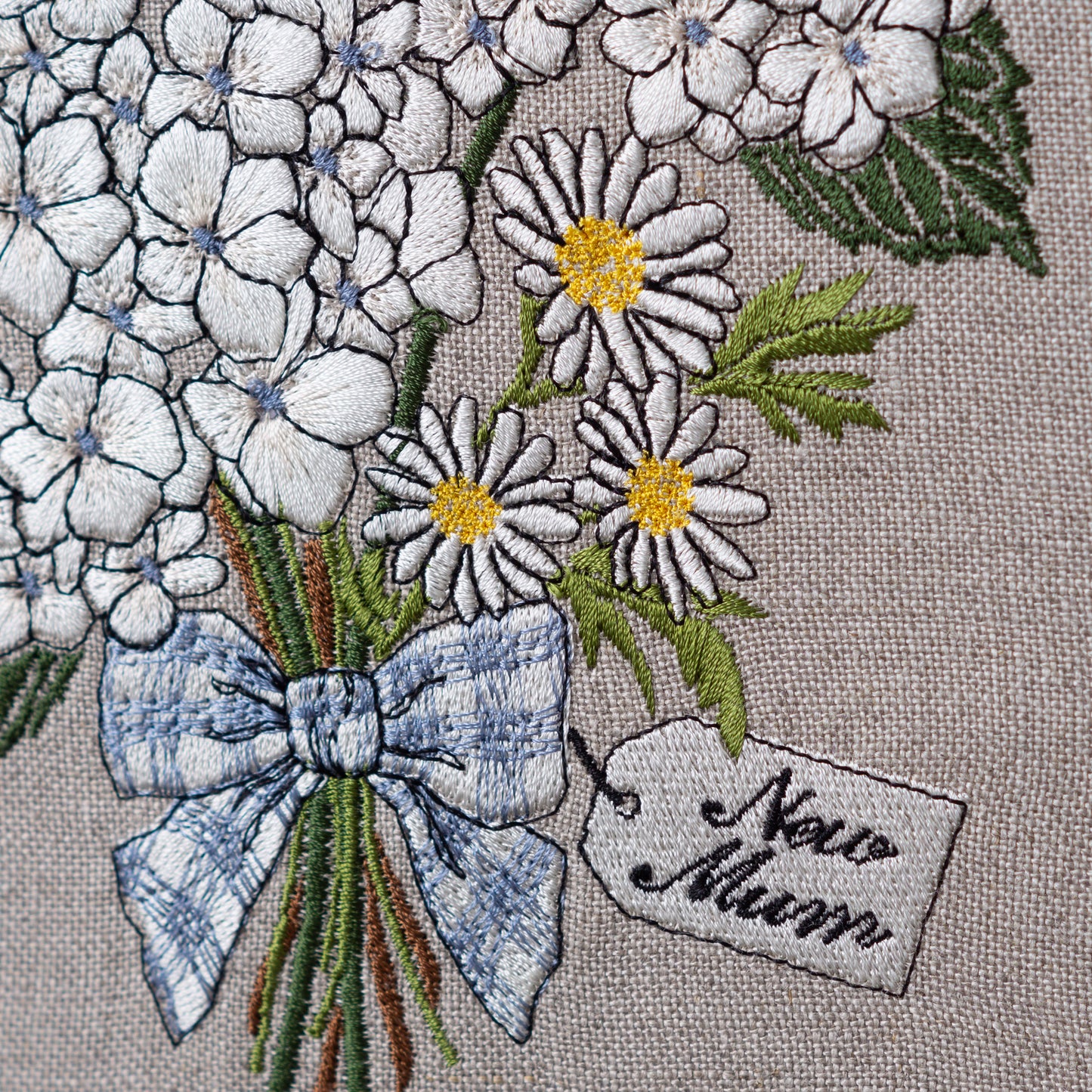 The New Mum/New Beginnings bouquet artwork features white hydrangeas, shasta daises and pussy willow, and is perfect for new mothers or anyone starting a new chapter in their life. Each embroidered bouquet is tied with either a pink or blue gingham bow, and can be personalised with a poignant name or date, making a beautiful keepsake to memorialize life's special moments.