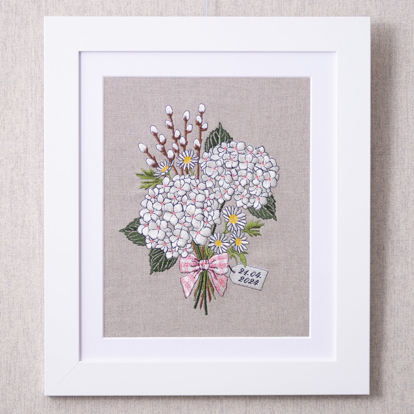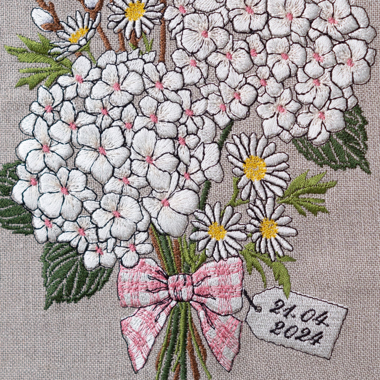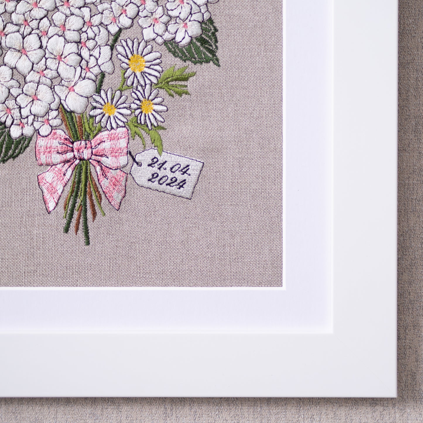 Please note, we can accommodate short names but please get in touch before ordering to double check if there is enough room for the name can be embroidered onto the tag. Artwork ordered without personalisation will be embroidered without the tag tied to the bouquet stems.