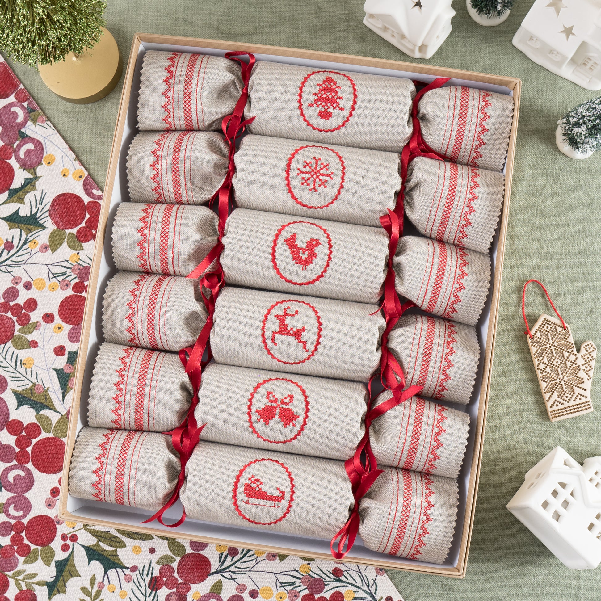 Available in ivory cotton or natural linen, these crackers can be purchased individually with either a sleigh, reindeer, snowflake, bells, bird or tree motif, or as a set of two, four or six in a gift box. Simply enter the motifs required in the box in the following format:-